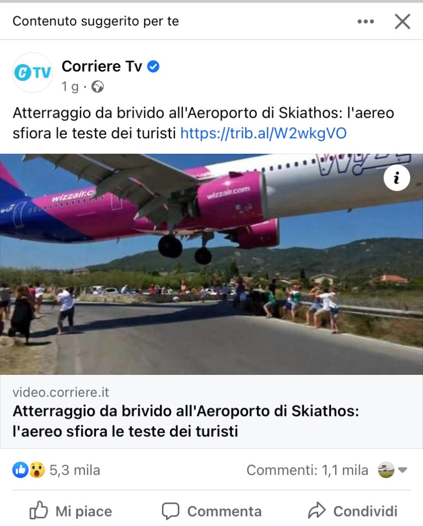 Oltre 5300 like e 1100 commmenti per questo post su Facebook di Corriere TV, la pagina video del noto quotidiano italiano. Oltre a migliaia e migliaia le visualizzazioni del video che pubblicammo almeno una settimana fa, il quale ritrae l’avvicinamento dell’A321neo Wizz Air a Skiathos proveniente da Napoli.