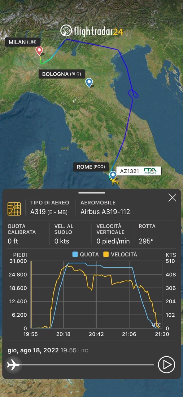 Oltre alla situazione dei dirottamenti di voli destinati a molti aeroporti del centro notte avvenuti nella mattinata di ieri. Tra la serata è la nottata c’è’ stato un ritorno dei forti piovaschi con un alta attività elettrica. Da notare la rotta dell’AZ1319 che dopo essere decollato da Roma per Bologna ha puntato verso il Mare Adriatico varcando la costa a Pesaro. A metà dello stesso ha fatto una holding per avere evidentemente istruzioni sul da farsi viste le avverse condimeteo a Bologna. Poi ha proseguito verso nord sorvolando la parte settentrionale della laguna di Venezia e quindi ha virato a sinistra raggiungendo ke prealpi vicentine e veronesi, sorvolando l’estremo nord del lago di Garda , quindi sulle Alpi bresciane ha invertito per la pianura padana sorvolando il lago d’Iseo fino a iniziare l’avvicinamento per Milano a Linate. In tutto un ora e 16 minuti anziche i 30-35 minuti classici o meno di un ora per una Roma-Milano Linate.