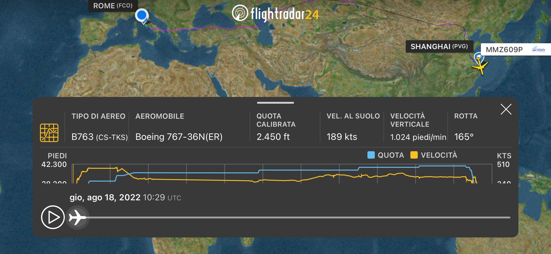 In precedenza aveva operato con lo stesso numero di volo MMZ609P da Beja a Shanghai.