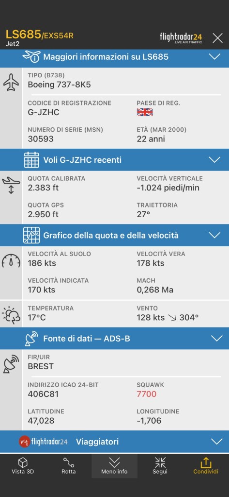 E’ quanto accaduto in questi momenti al voloJet2.com LS685 da East Midlands a Faro, che sta dirottando a Nantes. Non nota la ragione per la quale ha inserito il codice di emergenza generale 7700.