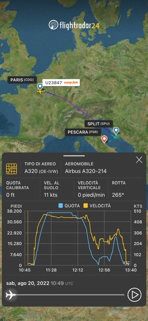Il volo easyJet U23847 con A320-200 OE-IVW da Parigi CDG a Spalato a causa del maltempo ha scelto di atterrare cautelarmente a Pescara.