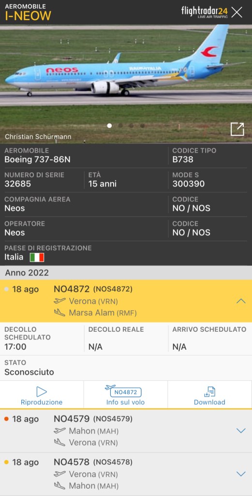 Il velivolo ha effettuato come ultimo volo un Mahon – Verona e poi era programmato su Marsa Alam nello stesso giorno, che ha poi non operato.