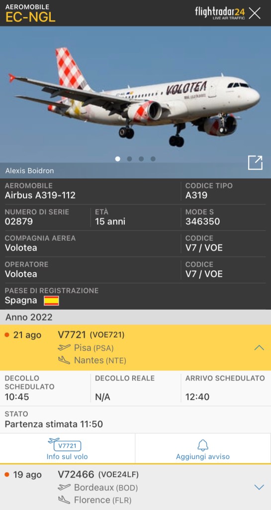 Due giorni fa l’A319-100 EC-NGL V72466 era giunto a Pisa da Bordeaux come volo diretto in realtà a Firenze, ma dirottato sull’aeroporto alternato per problemi meteorologici.