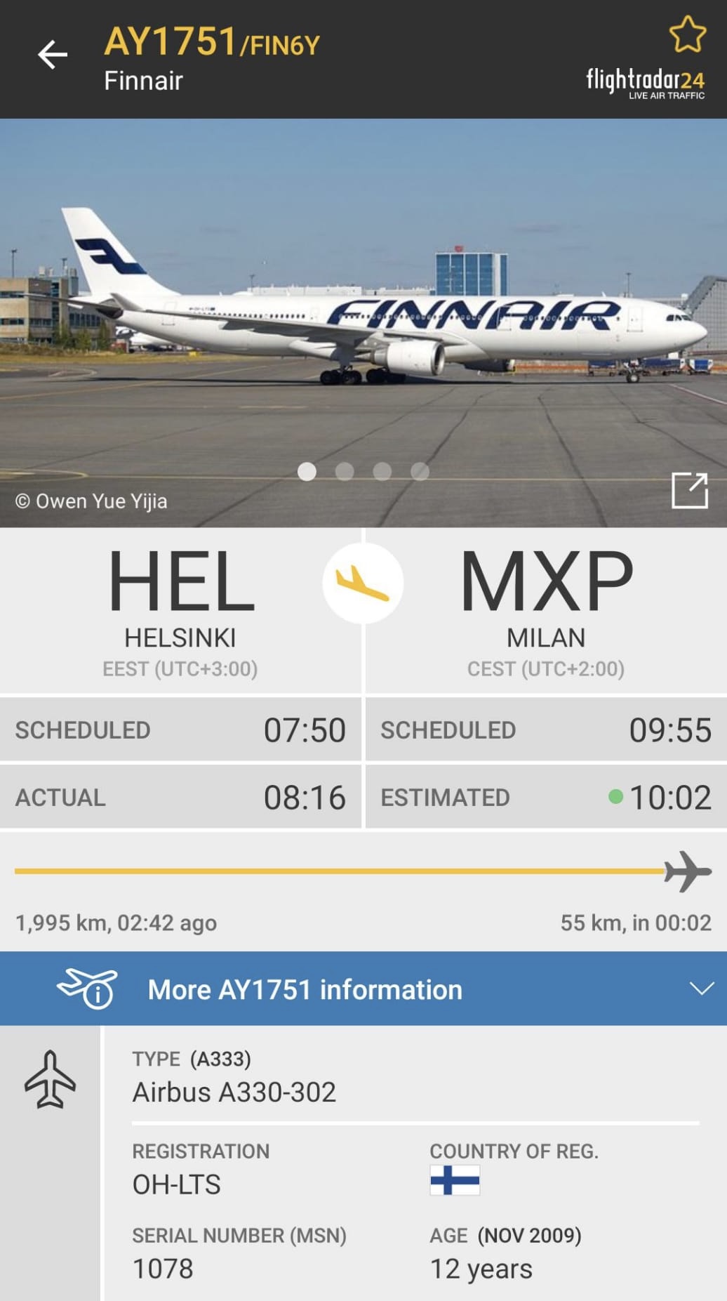 compagnie aeree Finnair oggi con A330 a Milano Malpensa Pubblicato da Italiavola il 22 agosto 2022 Questa mattina il volo AY1751 della Finnair e’ arrivato a Milano Malpensa con A330-302 OH-LTS. E’ un rafforzamento della rotazione in termini di capacità in quanto di norma impiega dall’A321 all’E190. Grazie a Leleair per la segnalazione. Condividi: Fai clic per condividere su Facebook (Si apre in una nuova finestra) Facebook Fai clic qui per condividere su LinkedIn (Si apre in una nuova finestra) LinkedIn Fai clic qui per condividere su Reddit (Si apre in una nuova finestra) Reddit Fai clic qui per condividere su Pinterest (Si apre in una nuova finestra) Pinterest Fai clic qui per condividere su Tumblr (Si apre in una nuova finestra) Tumblr Fai clic per condividere su X (Si apre in una nuova finestra) X Mi piace Caricamento... Correlati