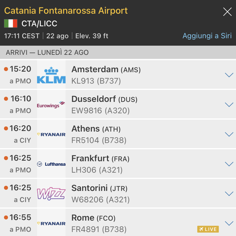 Sei i voli al momento dirottati in altri scali e previsti con destinazione Catania per il maltempo.