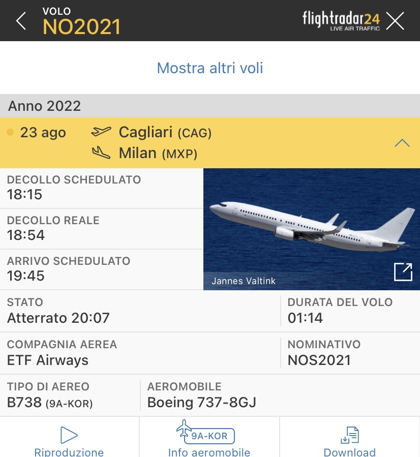 compagnie aeree ETF Airways vola per Neos Pubblicato da Italiavola il 23 agosto 2022 Quest’oggi Neos ha noleggiato questo B737/800 di ETF Airways 9A-KOR. Il velivolo e’ in ACMI ed e’ arrivato a Milano Malpensa nel pomeriggio da Parigi CDG e poi ha effettuato una rotazione per Cagliari e ritorno. Condividi: Fai clic per condividere su Facebook (Si apre in una nuova finestra) Facebook Fai clic qui per condividere su LinkedIn (Si apre in una nuova finestra) LinkedIn Fai clic qui per condividere su Reddit (Si apre in una nuova finestra) Reddit Fai clic qui per condividere su Pinterest (Si apre in una nuova finestra) Pinterest Fai clic qui per condividere su Tumblr (Si apre in una nuova finestra) Tumblr Fai clic per condividere su X (Si apre in una nuova finestra) X Mi piace Caricamento... Correlati