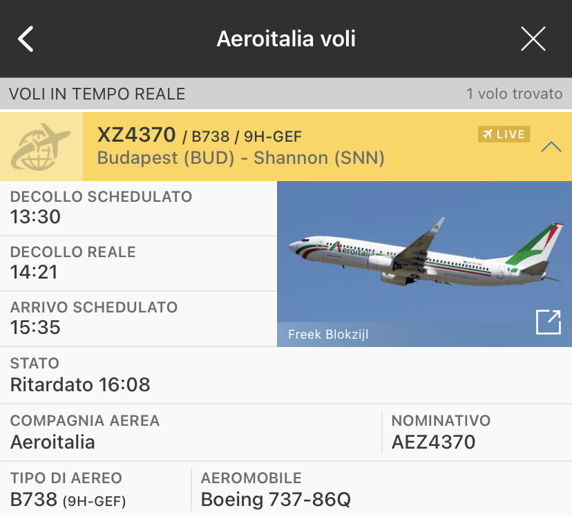 La compagnia aerea italiana sta impiegando il B737-86Q 9H-GEF. Era giunto a Budapest effettuando un Ferry flight da Roma Fiumicino.