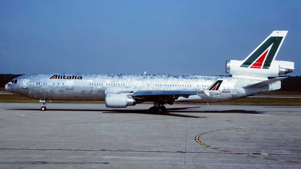 L’ultimo MD-11C Alitalia arrivo’ così. La necessità di introdurlo in linea fece si che fu accettato parzialmente verniciato con sole single e parte posteriore. Il resto fu lasciato per qualche tempo metallico.