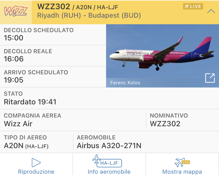 Il velivolo e’ un A320neo HA-LJF di Wizz Air Hungary con numero di volo WZZ302