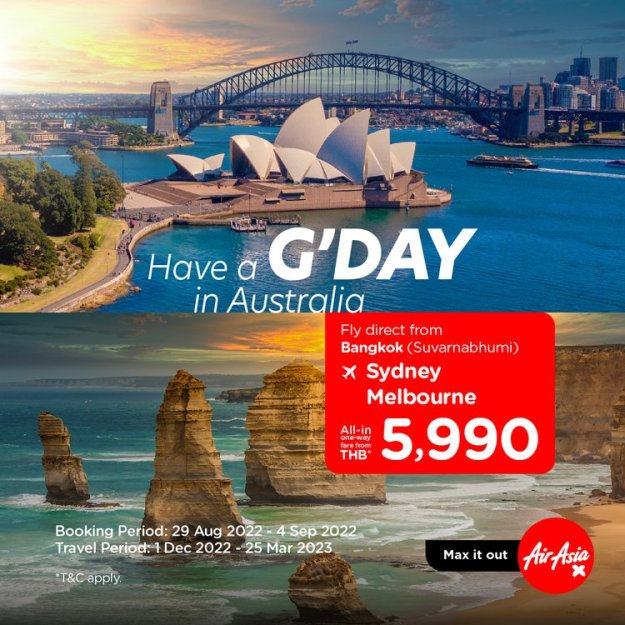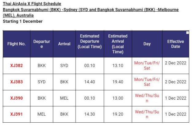 Thai AirAsia X (codice volo XJ) continua la sua espansione di rete con voli diretti verso le due maggiori città australiane, volando per la prima volta direttamente da Bangkok (Suvarnabhumi) a Melbourne e Sydney, a partire dal 1 e 2 dicembre 2022.