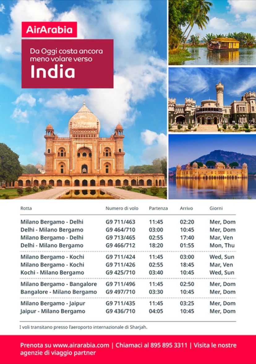 Delhi, Jaipur, Kochi e Bangalore sono a breve raggiungibili da Bergamo via Sharjah con il volo diretto della Air Arabia a partire dal 7 dicembre.
