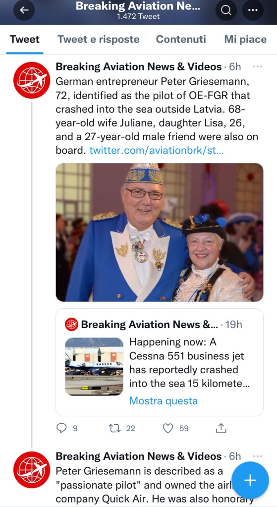 Ai comandi del Cessna Citation 551 OE-FGR precipitato ieri c’era il suo proprietario , un 72enne, Peter Griesemann. A bordo anche la moglie Juliane di 68 anni e la figlia Lisa di 26 anni e un amico di lei di 27.