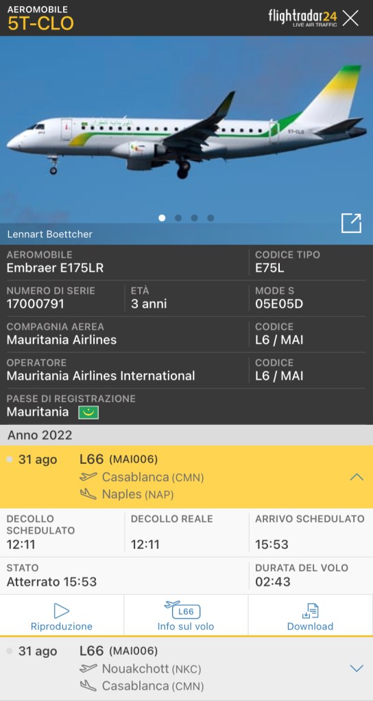 compagnie aeree E175 Mauritania Airlines International a Napoli Pubblicato da Italiavola il 7 settembre 2022 Questo E175LR della Mauritania Airlines International il 31 agosto ha volato da Nouakchott a Napoli con scalo intermedio a Casablanca come L6/MAI6. Il velivolo e’ presso Atitech per interventi di manutenzione programmata. Condividi: Fai clic per condividere su Facebook (Si apre in una nuova finestra) Facebook Fai clic qui per condividere su LinkedIn (Si apre in una nuova finestra) LinkedIn Fai clic qui per condividere su Reddit (Si apre in una nuova finestra) Reddit Fai clic qui per condividere su Pinterest (Si apre in una nuova finestra) Pinterest Fai clic qui per condividere su Tumblr (Si apre in una nuova finestra) Tumblr Fai clic per condividere su X (Si apre in una nuova finestra) X Mi piace Caricamento... Correlati