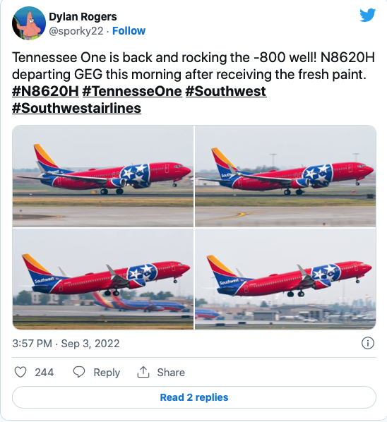 Il 3 settembre 2022 il Boeing 737-8H4 SSWL N8620H (msn 42526) è rientrato in servizio dopo essere stato verniciato con la livrea speciale “Tennessee One”.