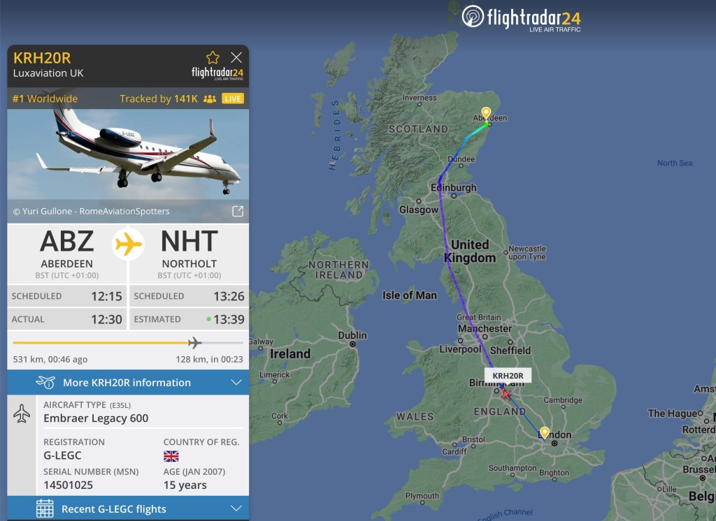 L’aereo ha operato da Aberdeen a Northolt, è un velivolo della Luxaviation UK.