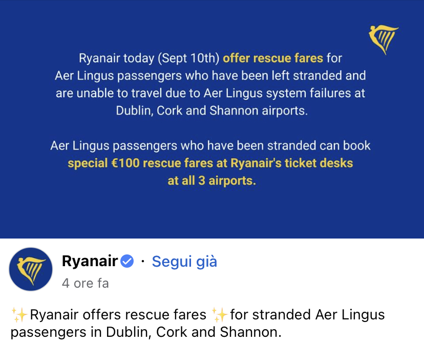 Ryanair si e’ offerta di trasportare i passeggeri coinvolti con l’emissione di una rescue fare da 100€. Su Facebook l’annuncio e’ apparso 4 ore fa.