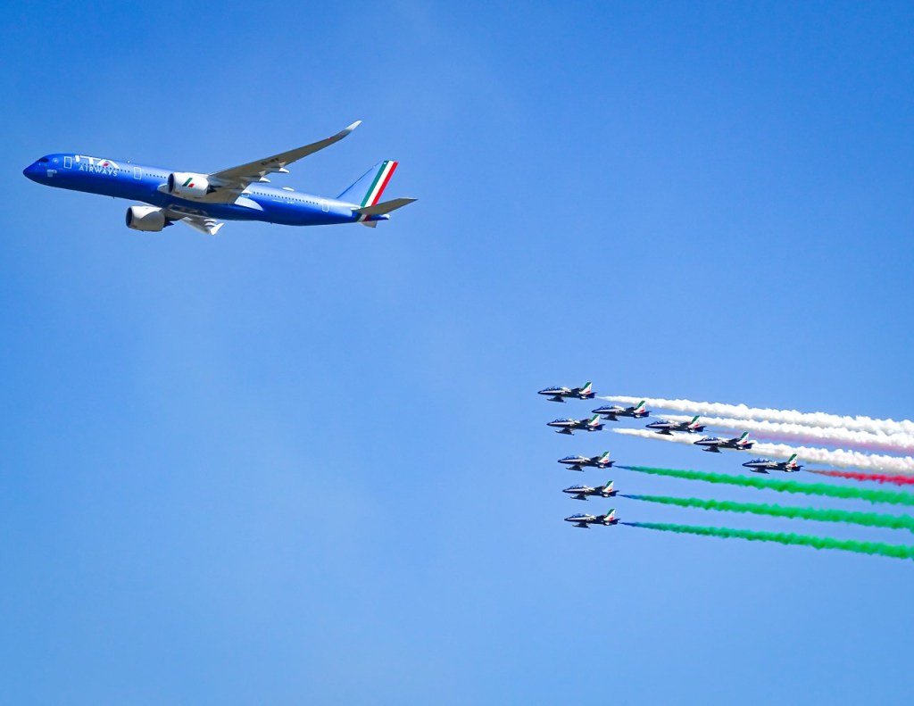 L’A350-900 della ITA Airways, il nuovo velivolo di punta del vettore italiano con la livrea blu, insieme sempre agli aerei blu dell’Aeronautica Militare, le Frecce Tricolori.