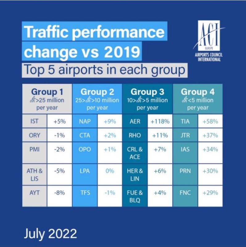 ACI – Airports Council International ha divulgato questa tabella che elenca gli aeroporti europei per più alta crescita nelle varie categorie nel mese di Luglio 2022.