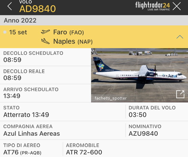compagnie aeree Un ATR72/600 Azul e’ arrivato a Napoli Pubblicato da Italiavola il 15 settembre 2022 Nel pomeriggio a Napoli e’ arrivato un ATR72/600 PR-AQB dell’aerolinea brasiliana Azul Linhas Aereas. Il velivolo e’ partito da Belo Horizonte e ha fatto scalo a Natal , Praia , Lanzarote e Faro come AD9840. Condividi: Fai clic per condividere su Facebook (Si apre in una nuova finestra) Facebook Fai clic qui per condividere su LinkedIn (Si apre in una nuova finestra) LinkedIn Fai clic qui per condividere su Reddit (Si apre in una nuova finestra) Reddit Fai clic qui per condividere su Pinterest (Si apre in una nuova finestra) Pinterest Fai clic qui per condividere su Tumblr (Si apre in una nuova finestra) Tumblr Fai clic per condividere su X (Si apre in una nuova finestra) X Mi piace Caricamento... Correlati