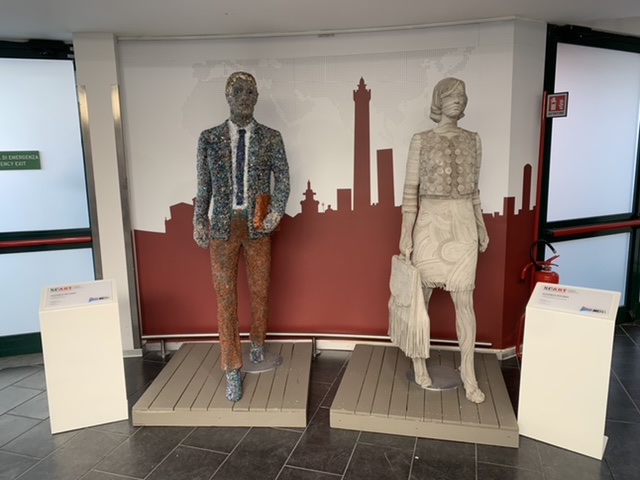Ogni statua, in particolare, è composta al 100% da materiali di scarto come filamenti di pelle, cartone, cinture di sicurezza, confezioni di piselli surgelati, sfridi di tessuto, vetro, legno e scaglie di plastica riciclata. Le opere esposte rappresentano un <catalogo= delle tipologie più diffuse di passeggeri e al tempo stesso sono un omaggio alla cultura dell’economia circolare, che sa valorizzare quanto già realizzato, per proiettarlo nel futuro.