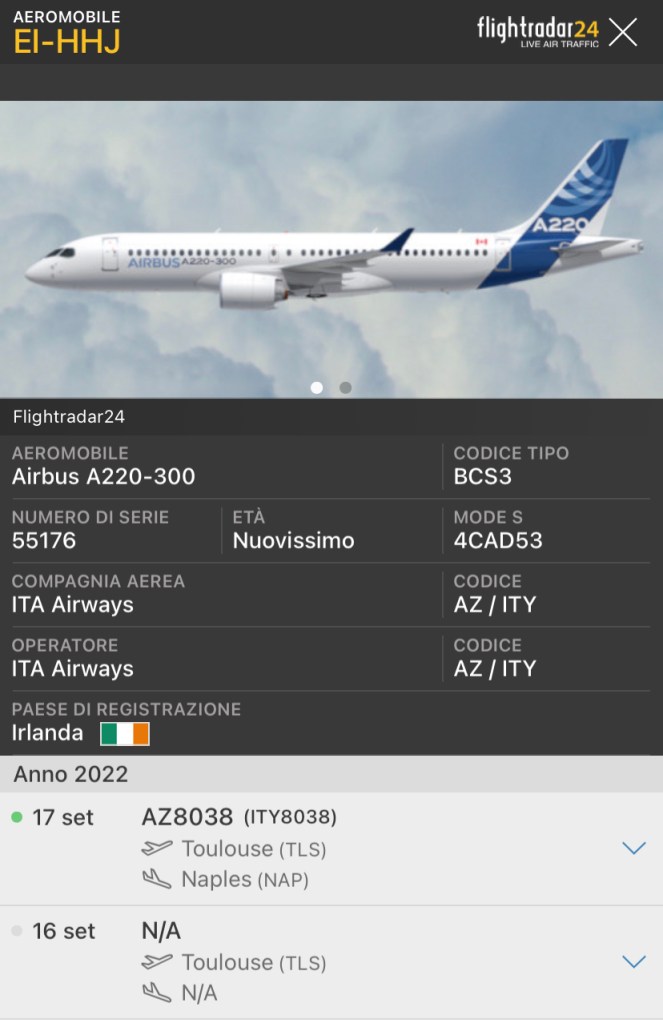E’ già nelle mani di ITA Airways l’Airbus 220-300 giusto poco più di un ora e mezza fa a Napoli proveniente da Tolosa.