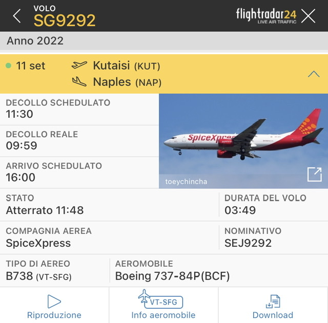 Il 10 e 11 settembre questo B737-84P BCF VT-SFG e’ arrivato a Napoli da Delhi via Kutaisi.