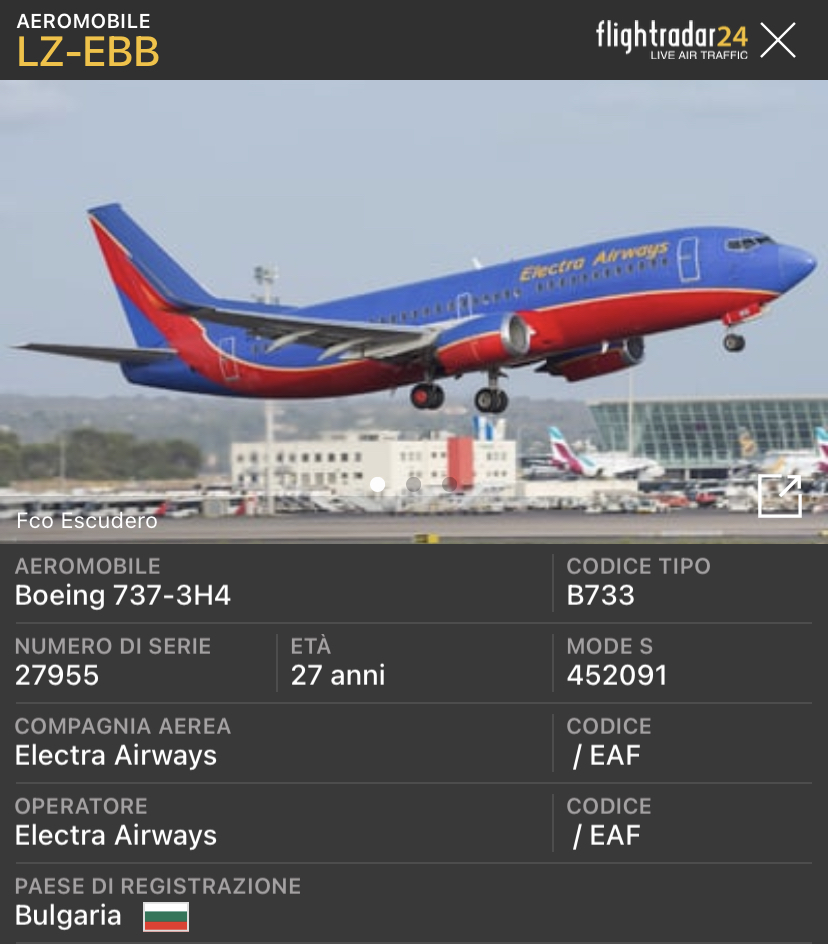 Questo aereo Boeing 737-3H4 con le marche LZ-EBB della Electra Airways e’ stato recentemente trasferito a Catania. Il fatto e’ avvenuto il 31 agosto con il Ferry flight originante da Varna in Bulgaria.