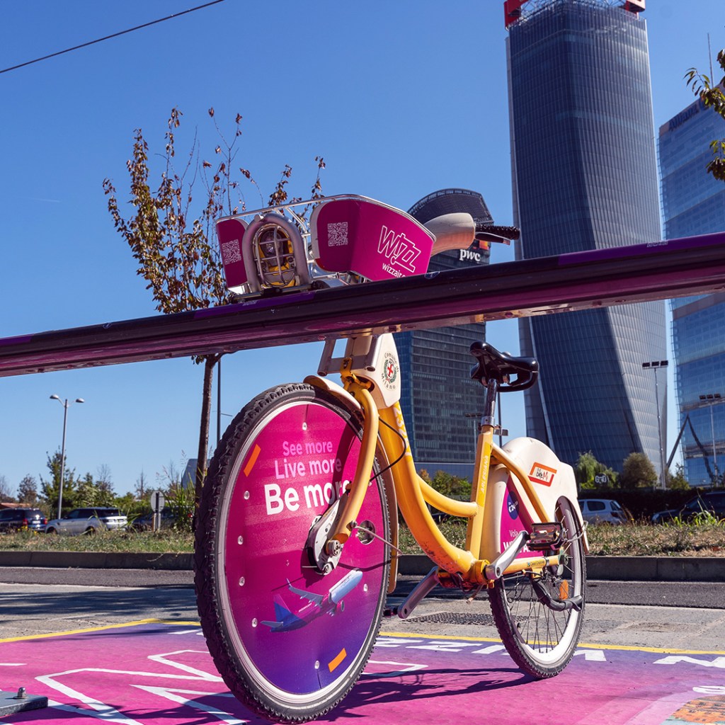 A Milano la Wizz Air da ieri ti chiede di viaggiare green con la forza e la spinta dei pedali delle biciclette con il brand Wizz Air.