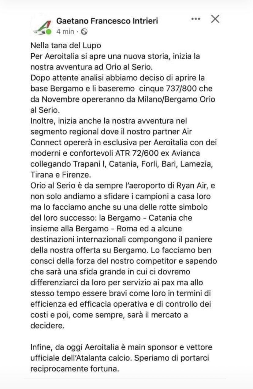 Così scrive Gaetano Francesco Intrieri – AD AeroItalia sul suo profilo Facebook: