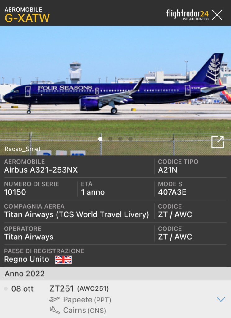 Qualche settimana fa l’A321-253NX G-XATW della Titan Airways lo avevamo conosciuto così nel suo primo giro intorno al mondo con a bordo una cinquantina di facoltosi clienti della TCS World Travel.