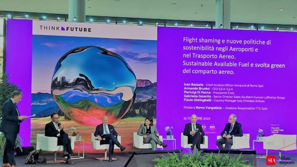 In occasione della cinquantanovesima edizione di TTG Travel Experience – ITALIAN EXHIBITION GROUP 2022, si è tenuta oggi la tavola rotonda dal titolo “Flight shaming e nuove politiche di sostenibilità negli Aeroporti e nel Trasporto Aereo. Sustainable Available Fuel e svolta green del comparto aereo” a cui ha partecipato l’Amministratore Delegato di SEA Milan Airports, Armando Brunini insieme a Ivan Bassato, Chief Aviation Officer Aeroporti di Roma, Pierluigi Di Palma, Presidente ENAC – Ente Nazionale per l’Aviazione Civile, Gabriella Galantis, Senior Director Sales Southern Europe Lufthansa Group e Flavio Ghiringhelli, Country Manager Italy EmiratesAirlines, con la moderazione di Remo Vangelista, Direttore Responsabile TTG Italia.