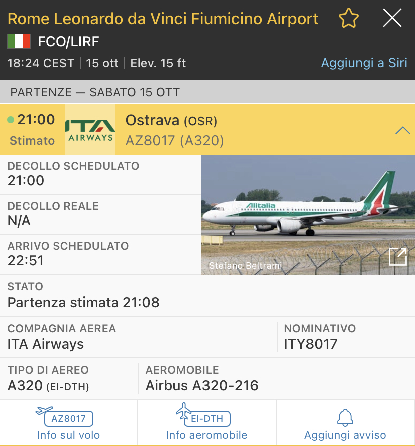 compagnie aeree ITA Airways, un altro A320 in serata va verso Ostrava Pubblicato da Italiavola il 15 ottobre 2022 Questo A320-216 in serata partira alle 21 per Ostrava da Roma Fiumicino come AZ8017. Ha le marche EI-DTH e nell’aeroporto ceco riceverà la nuova livrea. Condividi: Fai clic per condividere su Facebook (Si apre in una nuova finestra) Facebook Fai clic qui per condividere su LinkedIn (Si apre in una nuova finestra) LinkedIn Fai clic qui per condividere su Reddit (Si apre in una nuova finestra) Reddit Fai clic qui per condividere su Pinterest (Si apre in una nuova finestra) Pinterest Fai clic qui per condividere su Tumblr (Si apre in una nuova finestra) Tumblr Fai clic per condividere su X (Si apre in una nuova finestra) X Mi piace Caricamento... Correlati