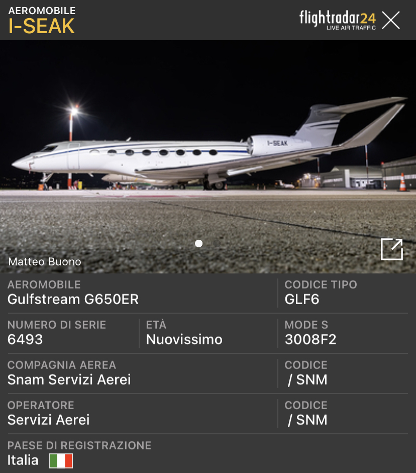 Il 29 settembre a Roma Ciampino e’ giunto dagli USA questo nuovissimo Gulfstream G650ER con le marche I-SEAK. L’aereo fa parte della flotta di SNAM Servixi Aerei e viene utilizzato insieme agli altri velivoli per necessità di trasferimento del personale di ENI. L’aereo ha il msn 6493.
