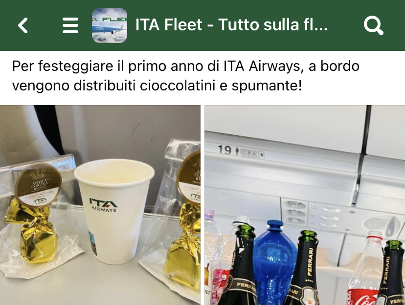 Da ITA Eet – tutto sulla flotta ITA Airways apprendiamo che il 15 ottobre, primo anniversario di operatività di ITA Airways la compagnia ha pensato di celebrarlo offrendo ai propri passeggeri e clienti un omaggio simbolico : cioccolatini Antica Corona Reale e spumante Ferrari Brut.
