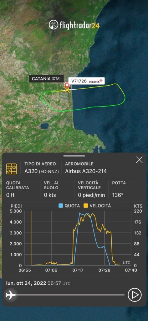 Esattamente un circuito, ovviamente non. Previsto e’ ciò che stamani ha compiuto poco dopo le 9 un A320-200 Volotea EC-NNZ impiegato sul previsto volo V7 1726 Catania – Genova. Invece dopo 15 minuti e’ riatterrato all’aeroporto della città etnea anziche come previsto in quella ligure.