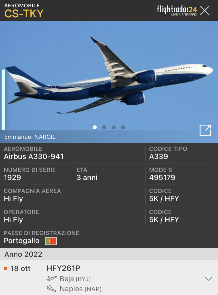 Senza categoria A330/900 Hi Fly a Napoli in manutenzione Pubblicato da Italiavola il 30 ottobre 2022 Il 18 ottobre e’ giunto a Napoli per attività di manutenzione programmata questo Airbus 330-941 CS-TKY della Hi Fly. Il velivolo ha effettuato una Beja – Napoli come HFY261P. Condividi: Fai clic per condividere su Facebook (Si apre in una nuova finestra) Facebook Fai clic qui per condividere su LinkedIn (Si apre in una nuova finestra) LinkedIn Fai clic qui per condividere su Reddit (Si apre in una nuova finestra) Reddit Fai clic qui per condividere su Pinterest (Si apre in una nuova finestra) Pinterest Fai clic qui per condividere su Tumblr (Si apre in una nuova finestra) Tumblr Fai clic per condividere su X (Si apre in una nuova finestra) X Mi piace Caricamento... Correlati