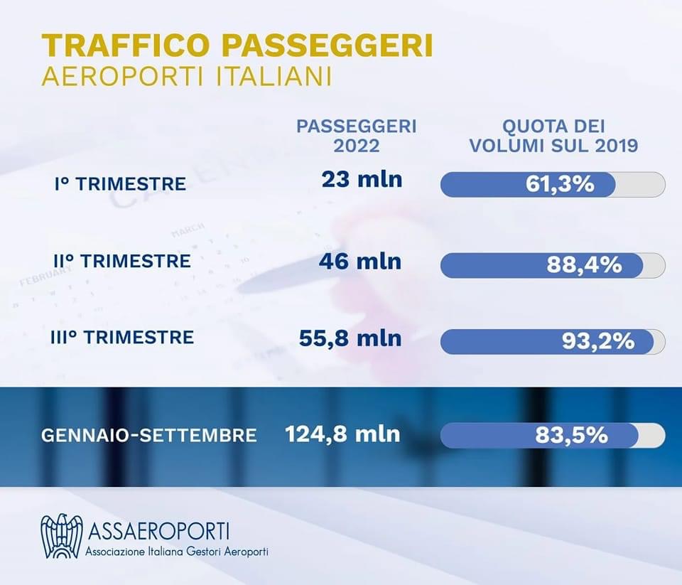 Nel terzo periodo dell’anno abbiamo visto 55,8 milioni e la percentuale sul 2019 sale al 93,2%. In questo trimestre e’ pieno l’effetto che molti scali hanno superato i volumi del 2019 a contraltare di una parte ancora sotto di poco o a doppia cifra a causa di una sofferenza dovuta a un traffico internazionale e intercontinentale mancante.