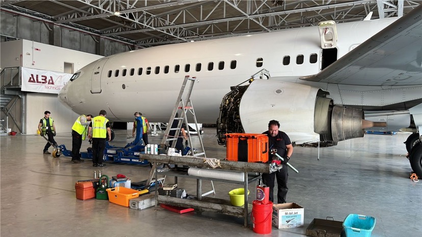 I due aerei hanno subito un cambio motore ciascuno, nella foto c’e’ il secondo aereo dove i tecnici della società di manutenzione stanno operando sul motore sinistro.