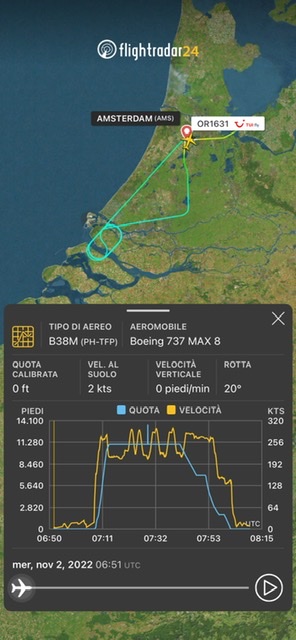 A seguire ha raggiunto la quota di FL110 ed e’ stato istruito ad andare in holding sul punto RIVER per 21 minuti compiendo 4 holding, a seguire e’ stato autorizzato a ritornare a Amsterdam per pista 27. In totale e’ rimasto in volo 55 minuti atterrando alle 10:02.