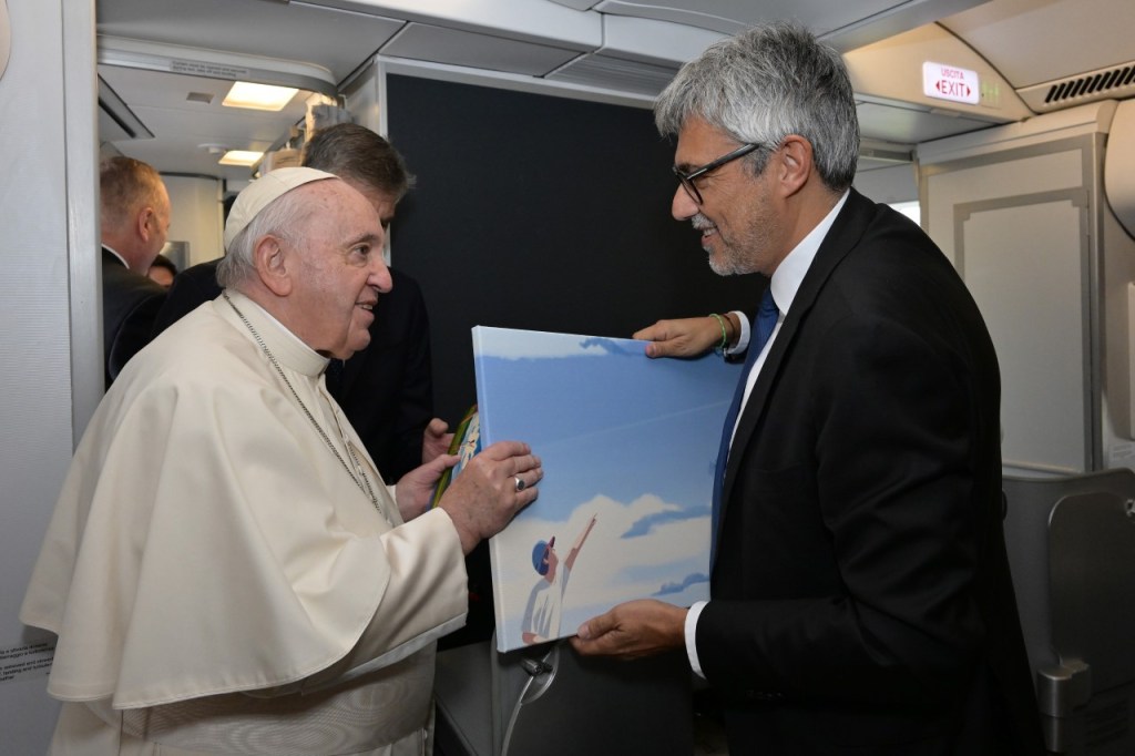 Questa mattina, ad accogliere il Santo Padre alla partenza del volo ITA Airways da Roma Fiumicino verso il Bahrein per il suo Viaggio Apostolico, l’Amministratore Delegato e Direttore Generale della Compagnia, Fabio Maria Lazzerini, ha consegnato a Papa Francesco una stampa su tela con l’illustrazione simbolo del “Manifesto della Sostenibilità”, a testimonianza dell’impegno di ITA Airways per un futuro più sostenibile.