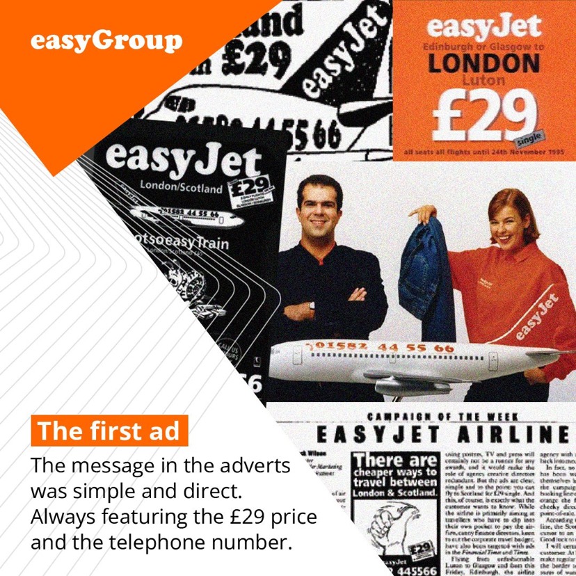 A quei tempi un giovane Stelios Haji-Ioannou mette la sua faccia per promuovere la sua creatura , da 29 sterline i biglietti per volare da Londra Luton a metà degli anni ‘90 verso la Scozia. Come si vede la donna che mostra un paio di jeans per paragonarli al costo di un biglietto per volare su questa aerolinea budget che si andava a contrapporre alla granitica British Airways. La campagna pubblicitaria e’ stata pensata proprio con il leit motiv “vola al visto di un paio di jeans”.