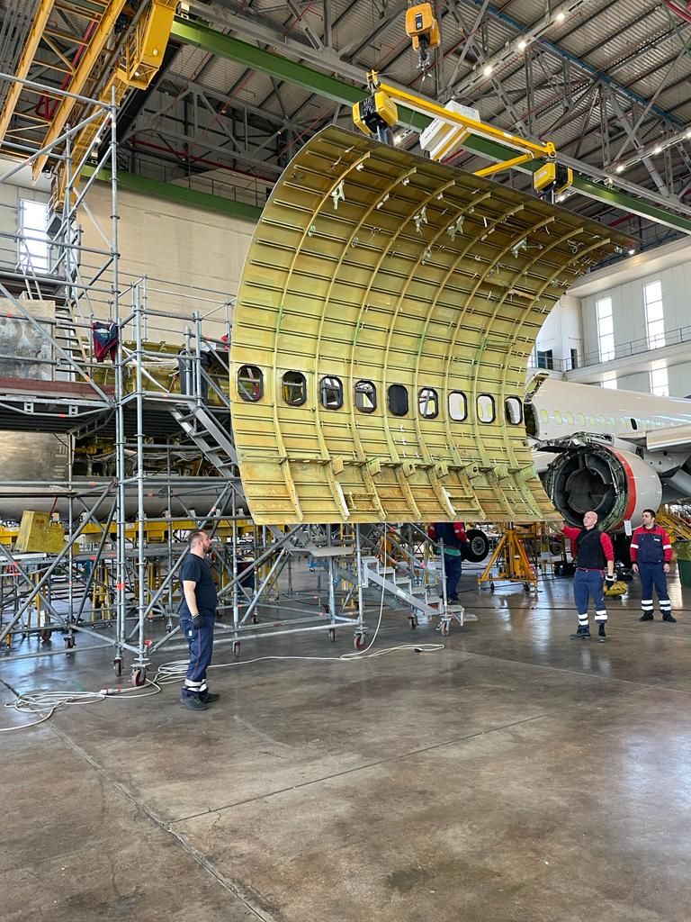 “In diretta da Atitech Avio 1, Napoli: Conversione PTF B737-800 in corso. Pietra miliare del taglio puntuale della pelle della fusoliera. Cellula del velivolo a carico zero stress utilizzando martinetti, culle e strumenti appropriati.