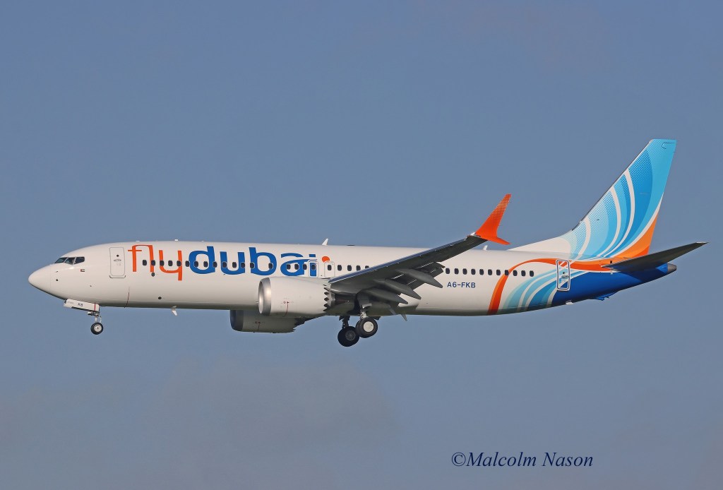 Nella foto con il sole a Shannon di Malcolm Nason c’è un Boeing 737-8 MAX in volo di consegna dagli USA a Dubai con stop nell’aeroporto irlandese.
