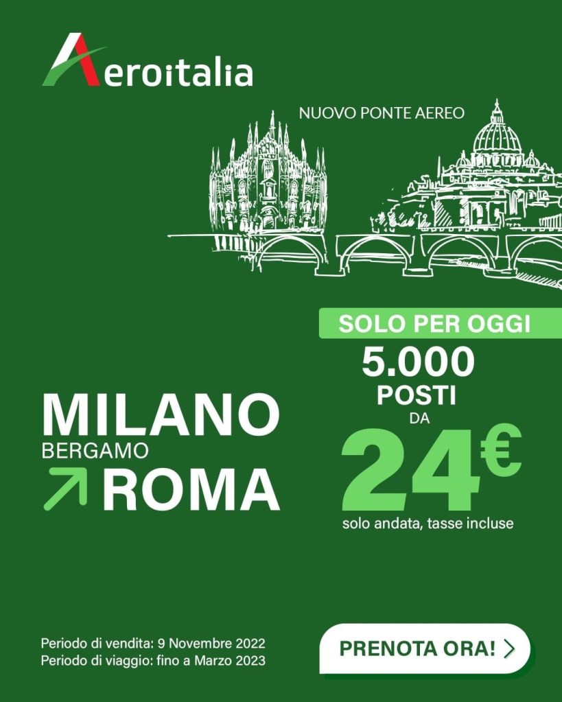 Solo per Oggi AeroItalia ha messo in vendita 5000 posti da 24€ per la rotta shuttle tra Milano Bergamo e Roma Fiumicino.