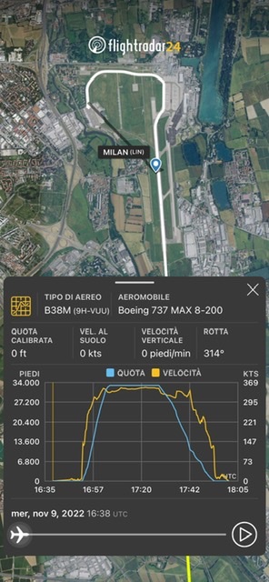 Il volo FR911 e’ stato operato con Boeing 737-8200 9H-VUU e’ poi ripartito come FR912 per Bergamo.