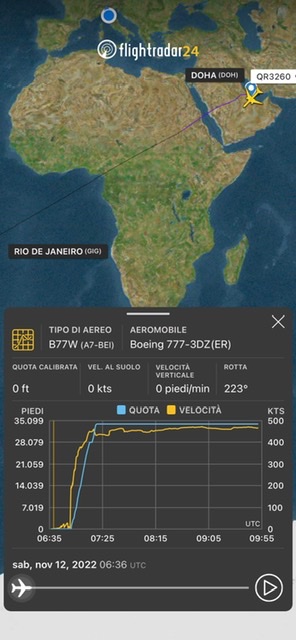 In questo momento un Boeing 777-3DZ ER A7-BEI QR3260 e’ decollato da Doha come Ferry flight per Rio de Janeiro. Ora l’aereo e’ sul Sudan, a breve sul Chad e ha una rotta praticamente diritta verso il Brasile.