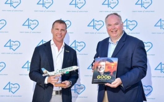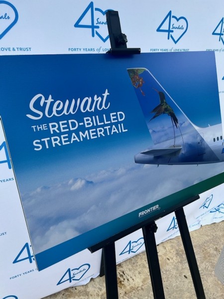 Lo streamertail dal becco rosso si chiamerà Stewart, un cenno al compianto Gordon “Butch” Stewart (sotto, a destra), il leggendario fondatore di Sandals Resorts International e prolifico sostenitore del turismo in Giamaica. Il nuovo velivolo dovrebbe entrare a far parte della flotta di Frontier alla fine del 2023.