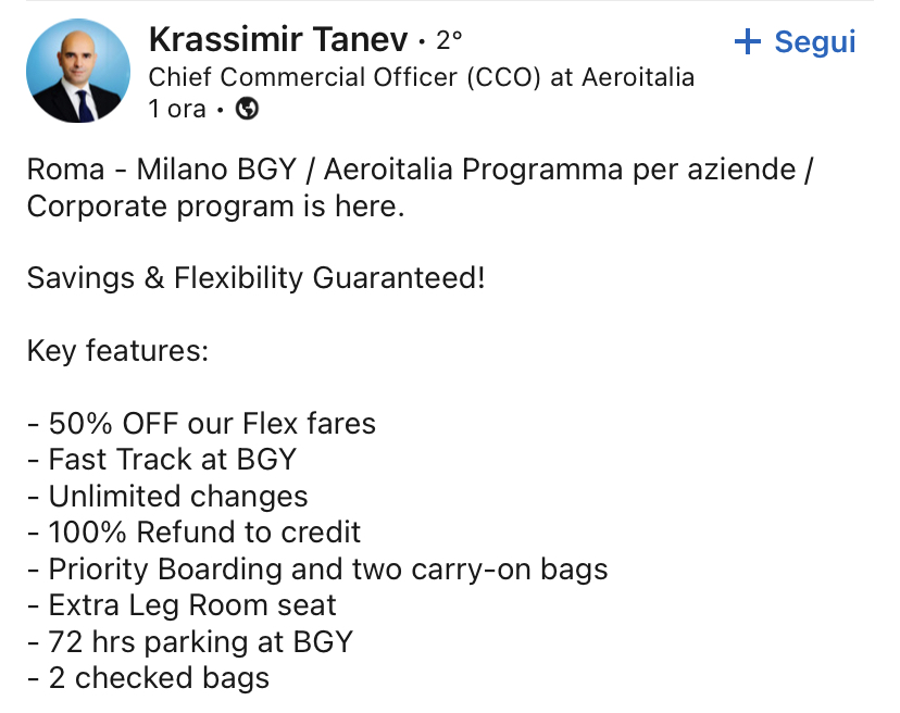 Krassimir Tanev – CCO del vettore italiano ha esposto su LinkedIn , il social business quello che e’ lo stato dell’arte delle proposte.