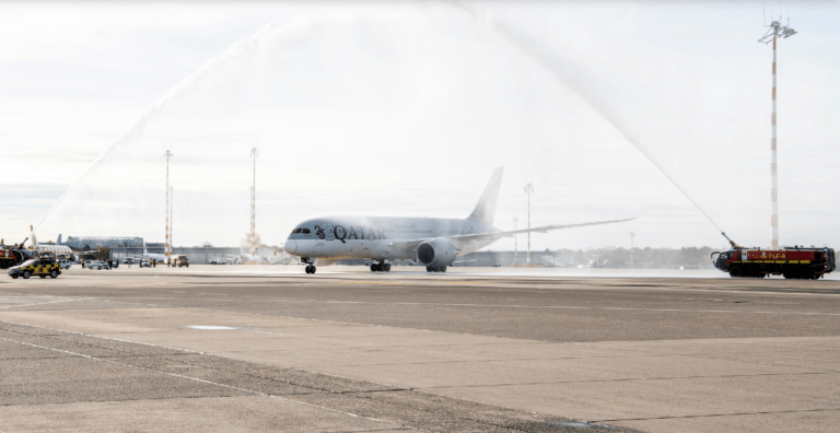 Il volo inaugurale di Qatar Airways da Doha a Düsseldorf in Germania è atterrato all’aeroporto internazionale di Düsseldorf martedì 15 novembre 2022, segnando il lancio dell’ultima destinazione tedesca della compagnia aerea. Il volo è stato accolto con un saluto di cannone ad acqua all’arrivo.