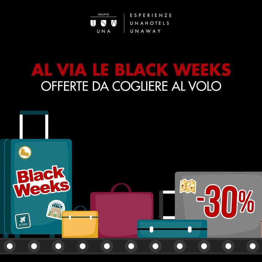 Gruppo UNA anticipa il venerdì di shopping più atteso dell’anno e annuncia il ritorno delle Black Weeks, oltre due settimane in cui cogliere l’occasione di prenotare il prossimo soggiorno in una selezione di hotel e resort UNA Esperienze, UNAHOTELS ed UNAWAY a prezzi speciali.